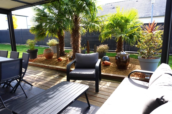 Votre conseillère Noovimo Sandrine Hinault 0678220258 shinault@noovimo.fr vous propose: Située sur la commune de Ploumagoar,dans un quartier résidentiel calme, proche bourg, 6 mn à pied ,maison contemporaine de plain pied et bénéficiant d'un terrain de 707m2. Prestations de qualité ! Vous n'êtes pas à l'abri d'un coup de coeur en visitant cette contemporaine lumineuse, et meublée avec goût. Ce bien s'ouvre sur une entrée (dressing), salon/ séjour, cuisine ouverte aménagée et équipée.Vous profiterez de deux terrasses en accès directe du séjour et du salon, parfaitement exposées et sans vis à vis, avec chacune une pergola bio climatique, récente, ( espace jacuzzi ,8 personnes, salon détente, coin repas ) Un couloir dessert une chambre avec dressing, deux chambres avec placard/dressing. Une salle de bain/douche à l'italienne, un wc séparé. Un garage attenant d'environ 22m2, porte électrique et point d'eau. Côté jardin, vous profiterez d'un bel espace paysagé avec soins ,entièrement cloturé et disposant de deux portails électriques, un abri de jardin, un grand carport de 28m2. Chauffage au sol, poêle à bois, tout à l'égout conforme. Aucun travaux à prévoir, la maison peut être vendue entièrement meublée.
